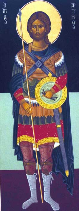 - He came from a noble family, and was appointed military Governor of Alexandria and Egypt by the Emperor Constantine the Great. Some years later, the Emperor Julian the Apostate strove to restore pagan idolatry as the official religion of the Empire. He also entered into a war with Persia, and established Antioch as his headquarters for pursuing the war. In Alexandria, Artemius received an order to come to Antioch with the military forces under his command. Artemius reported to the apostate Emperor just in time to see him ordering the cruel execution of two pious Christians, Eugenius and Macarius. Fearlessly, Saint Artemius immediately denounced the Emperor, telling him to his face that his anti-Christian policy was of demonic origin. The enraged Emperor instantly had Artemius stripped of all official rank and thrown into prison. The following day, he had Artemius brought before him and promised him high Imperial office if he would only renounce Christ and worship the idols. When Artemius forcefully refused to do this, he was publicly tortured to death. A pious noblewoman secretly recovered the Saint’s relics and took them to Constantinople, where they were venerated and wrought many miracles for several centuries.